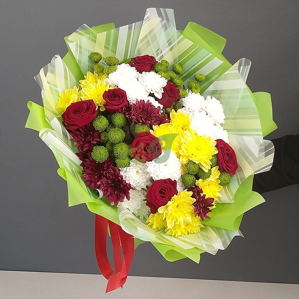 Сборный букет цветов 7 роз и хризантемы